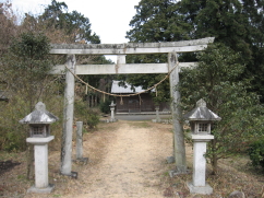 すが、南は畑に向かって開けています。参道の最南端に社号標石があり、畑中を少し歩くと鳥居があります。鳥居の奥に拝殿が見え、少しばかりの広場があります。拝殿は平屋造瓦葺で、そこから連続するように本殿があります。本殿は明神造柿葺で明治21年に建てられたもので、神社の本殿としては比較的新しい建造物であるが、外から直接見ることはできません。