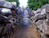 標高の高い尾根上などに、3ブロックに分かれて営まれたのが城山古墳群で、多くが積石塚古墳です。1991年に発掘調査された3基のうち、2基が積石塚填で1基が盛土填でした。積石塚墳の6号墳は、埋葬施設が2つ並ぶ珍しい古墳でした。現在、一宮中学校の敷地内に移築復元されています。