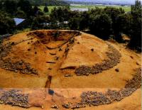 大木田面が北部で幅を狭めるあたりの、西からのびる台地上に営まれた大型円墳が小金古墳です。1992年の発掘調査の結果、直径36mの円墳で2段築成、上下2つの斜面全体に茸石を施していたことも明らかになりました。円墳としては、東三河で最大規模の古墳です。 残念なことに、古墳の主体部はまったくその痕跡を残しておらず、本来この古墳に伴ったであろう副葬品等も皆無で、時代の違う遺物が出土したにとどまっています。ただ、古墳の形状や立地から中期の古墳であろうことはまず間違いありません。おそらく5世紀の前半代に、大きな権力がこのあたりに存在したことでしょう。 |